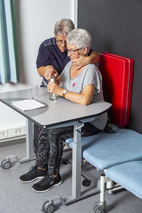ErgoMultibordets to udskæringer gør det muligt for ergoterapeuten at komme under øjenhøjde, tæt på patienten, opnå en god øjenkontakt forfra og samtidig selv opnå en stabil arbejdsstilling til at facilitere patienten med et kæbekontrolgreb forfra. Her støtter ergoterapeuten venstre albue på bordet, hvilket er med til at minimere det statiske arbejde for hånd, arm og skulder.