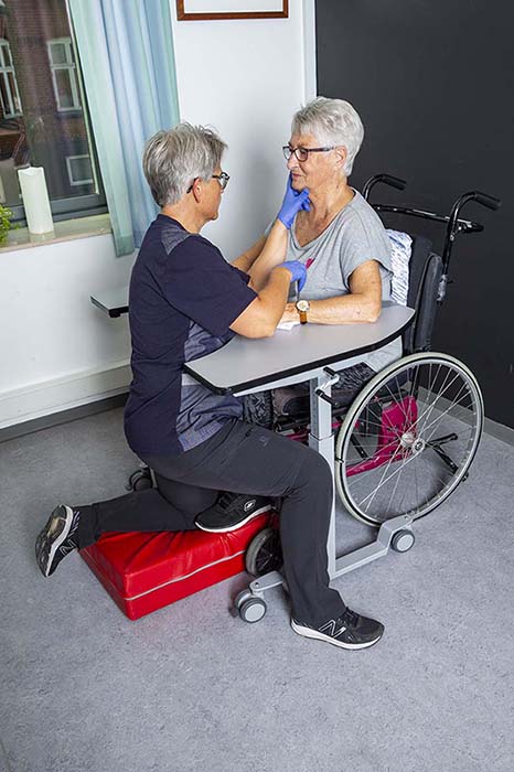 4. Patienten sidder i aktivkørestol ved ErgoMultibordet med to udskæringer, og ergoterapeuten sidder foran med knæet på en pack